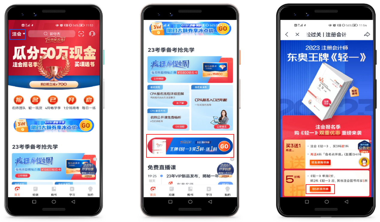 ② 點(diǎn)擊注會(huì)圖書進(jìn)入注會(huì)圖書界面,點(diǎn)擊“領(lǐng)5折購書卷”。