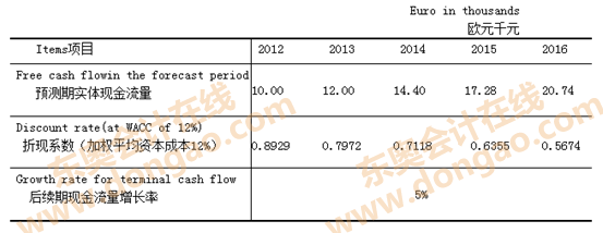 201 2年初,L集團(tuán)與H集團(tuán)的談判仍在進(jìn)行中。此時(shí),某投行聽(tīng)說(shuō)L集團(tuán)有意尋求收購(gòu)歐洲的機(jī)械制造企業(yè),便找到L集團(tuán)在歐洲的投資顧問(wèn)B先生(一位英國(guó)人),向其推薦了Y公司,并提供了下列現(xiàn)金流量預(yù)測(cè)以及估值數(shù)據(jù),供L集團(tuán)參考。Y公司為一家上市公司,截至2011年12月30日Y公司收盤股價(jià)15歐元/股,總股數(shù)為1千萬(wàn)股。2011年末凈負(fù)債為3千萬(wàn)歐元。