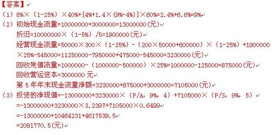 1.甲公司是一家制藥企業(yè)。2008年,甲公司在現(xiàn)有產(chǎn)品P-I的基礎(chǔ)上成功研制出第二代產(chǎn)品P-II。如果第二代產(chǎn)品投產(chǎn),需要新購置成本為10 000 000元的設(shè)備一臺,稅法規(guī)定該設(shè)備使用期為5年,采用直線法計提折舊,預(yù)計殘值率為5%。第5年年末,該設(shè)備預(yù)計市場價值為l 000 000元(假定第5年年末P-II停產(chǎn))。財務(wù)部門估計每年固定成本為600 000元(不含折舊費),變動成本為200元/盒。另,新設(shè)備投產(chǎn)初期需要投入凈營運資金3 000 000元。凈營運資金于第5年年末全額收回。