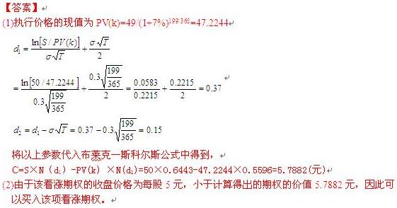 東奧輔導(dǎo)書《輕松過關(guān)一》第114頁綜合題第1題考核的該知識點。2.2009年8月15日,甲公司股票價格為每股50元,以甲公司股票為標的的代號為甲49的看漲期權(quán)的收盤價格為每股5元,甲49表示此項看漲期權(quán)的行權(quán)價格為每股49元。截至2009年8月15日,看漲期權(quán)還有l(wèi)99天到期。甲公司股票收益的波動率預(yù)計為每年30%,資本市場的無風險利率為年利率7%。