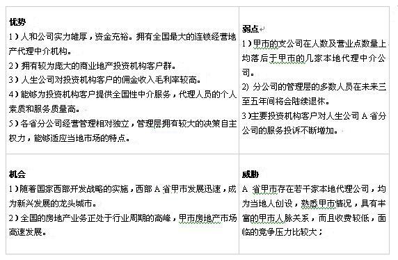 (2)利用SWOT分析的結(jié)果,簡(jiǎn)要分析甲市的產(chǎn)業(yè)發(fā)展對(duì)人生公司全國業(yè)務(wù)經(jīng)營的影響,以及由此產(chǎn)生的人生公司總部、各省分公司及A省分公司管理層之間的矛盾。