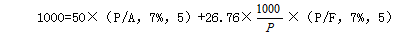 =50×(P/A,7%,5)+1000×(P/F,7%,5)=50×4.1002+1000×0.7130=205.01+713=918.01(元)