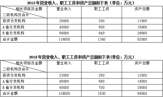 3.某保險公司總機構(gòu)設(shè)在我國某大城市,除在該大城市設(shè)立具有獨立經(jīng)營職能的投資分支機構(gòu)(該投資分支機構(gòu)的經(jīng)營收入、職工工資和資產(chǎn)總額與管理職能部門能分開核算)外,還分別在我國A、B兩省省城設(shè)有從事保險業(yè)務(wù)的二級分支機構(gòu)。該保險公司實行以實際利潤額按季預(yù)繳分攤企業(yè)所得稅的辦法,根據(jù)2014年第一季度報表得知,公司第一季度取得利息和保費收入共計36000萬元、發(fā)生的稅前可扣除的成本費用共計25984萬元(不含營業(yè)稅、城市維護建設(shè)稅、教育費附加)。此外,從公司以前年度報表中得知投資分支機構(gòu)和A、B兩省的二級分支機構(gòu)2013年度有關(guān)資料如下: