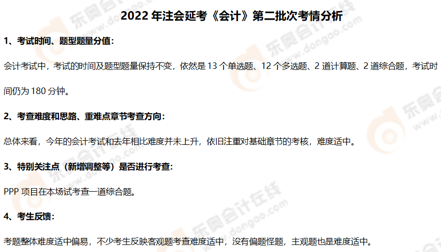 2022年注會(huì)延考《會(huì)計(jì)》第二批次考試已落下帷幕,考生們自信滿滿地走出了考場(chǎng)。東奧會(huì)計(jì)在線根據(jù)考生回憶反饋,為大家整理了2022年注會(huì)延考《會(huì)計(jì)》第二批次考點(diǎn)總結(jié)及考情分析,快來(lái)看看今年考了哪些內(nèi)容!