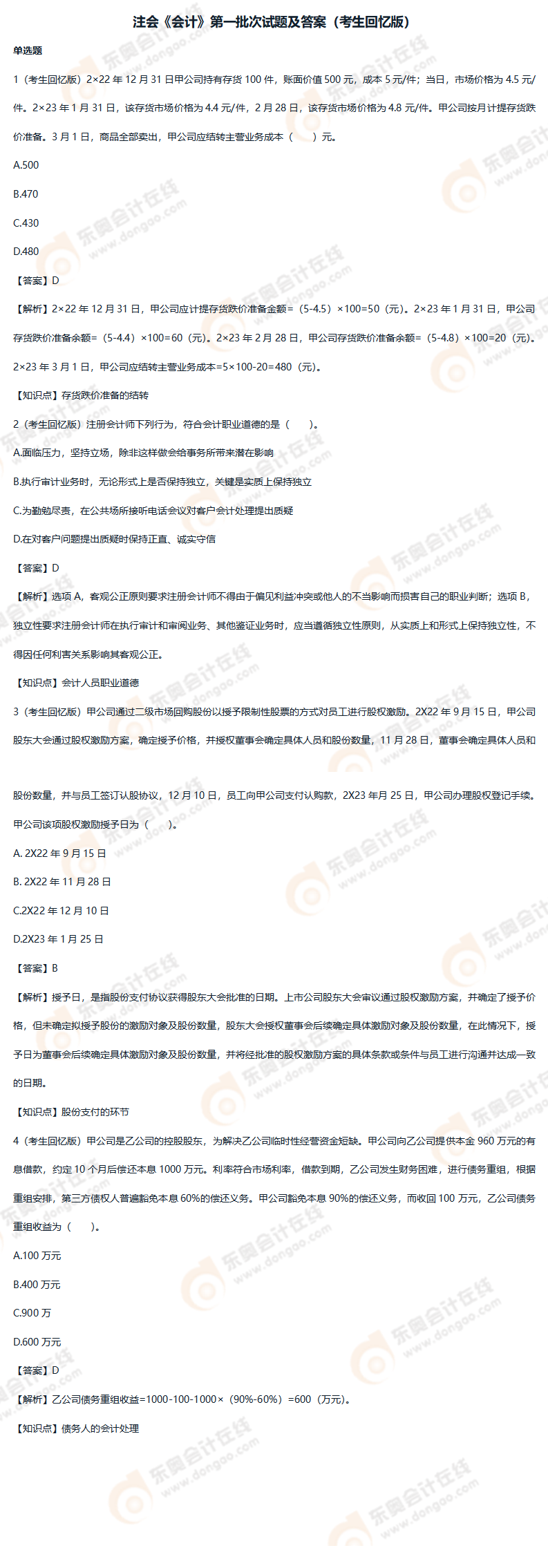 2023年注會(huì)會(huì)計(jì)考題及參考答案第一批次(考生回憶版)