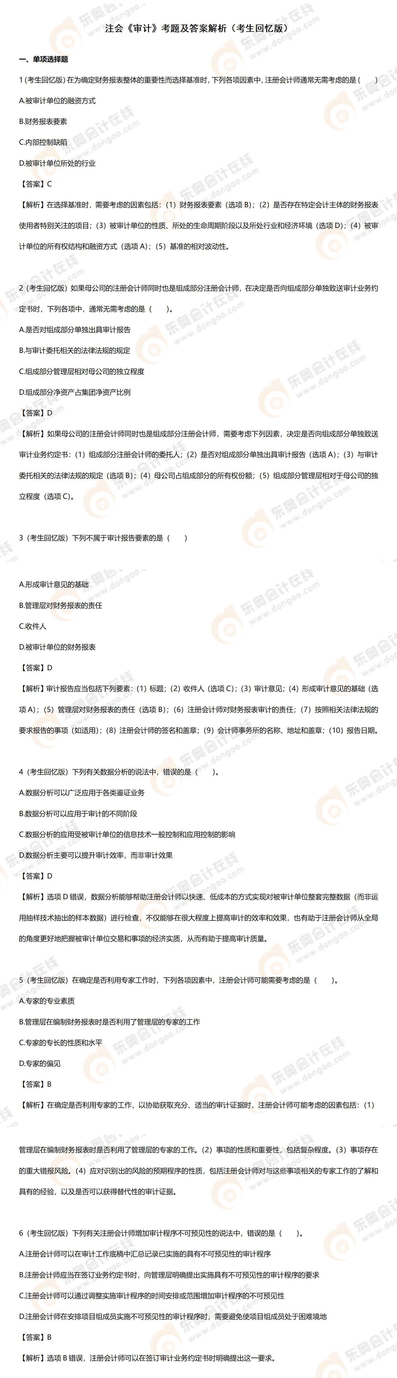 注:以上注冊會計師考試試題內容由考生回憶反饋,東奧教研團隊統(tǒng)計,東奧會計在線整理發(fā)布