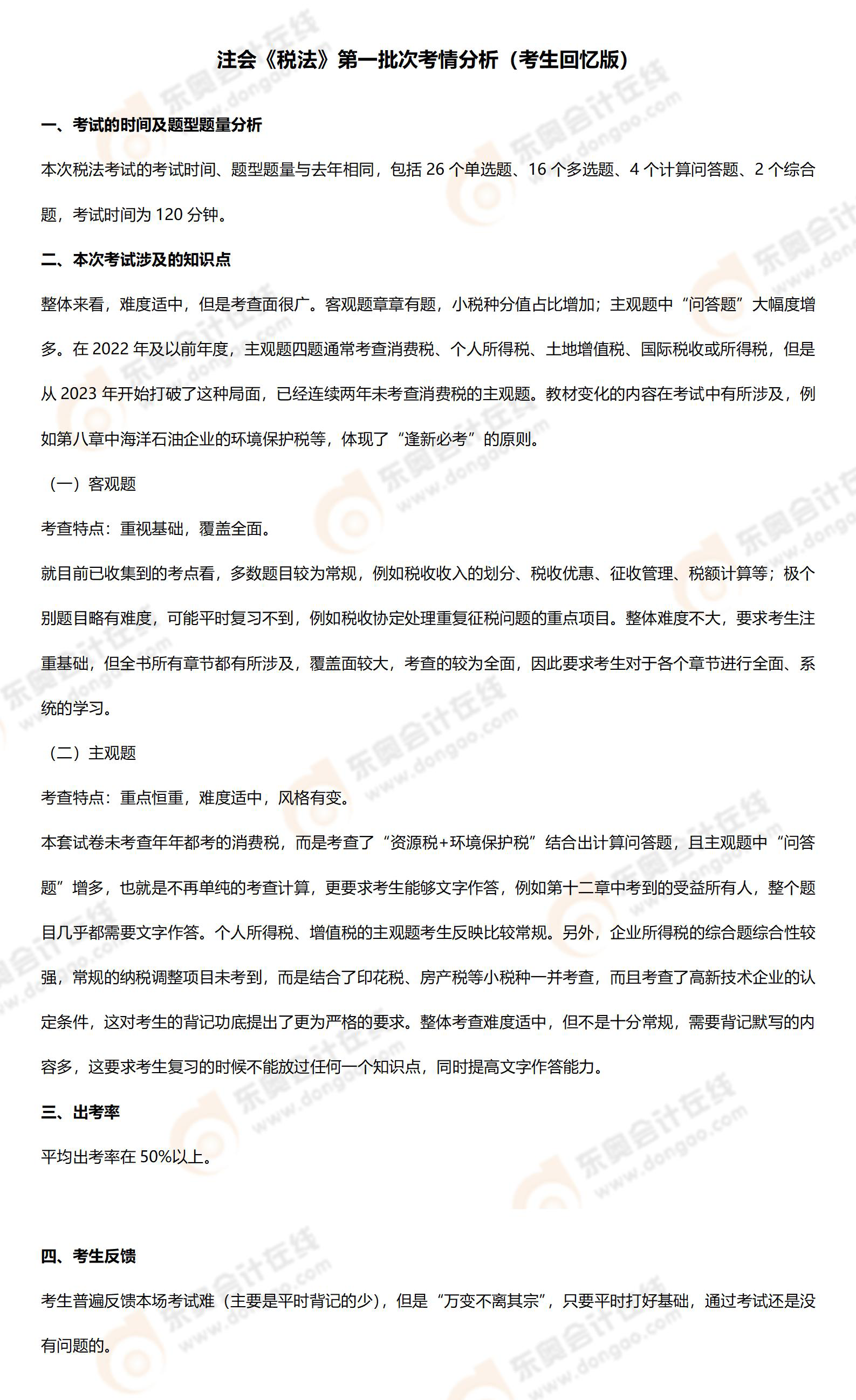 2024年注會稅法第一批次考情分析及考點總結(jié)(考生回憶版)