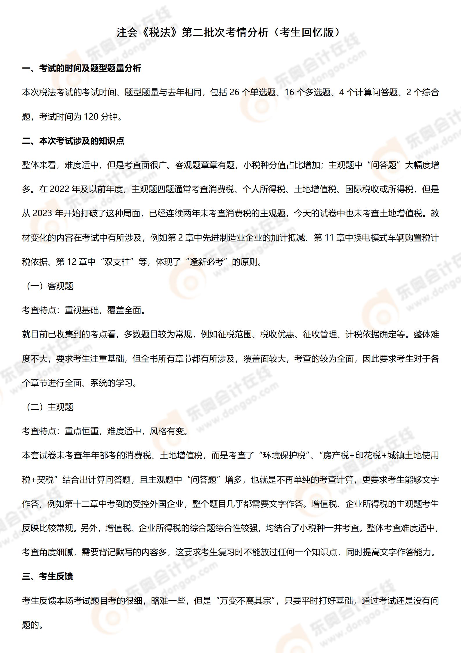 2024年注會稅法第二批次考情分析及考點總結(考生回憶版)