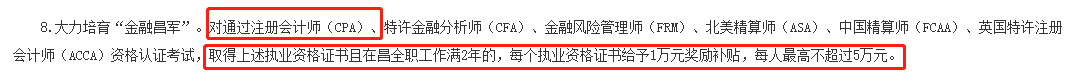 在南昌市人民政府辦公室印發(fā)的關(guān)于促進(jìn)全市金融業(yè)高質(zhì)量發(fā)展的若干政策措施的通知中表明:取得 注冊會(huì)計(jì)師執(zhí)業(yè)資格證書在昌全職工作滿2年的,給予1萬元獎(jiǎng)勵(lì)補(bǔ)貼,每人最高不超過5萬元。政策原文戳我獲?。荆荆?/strong>