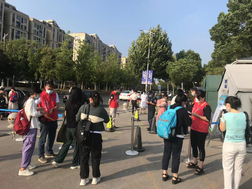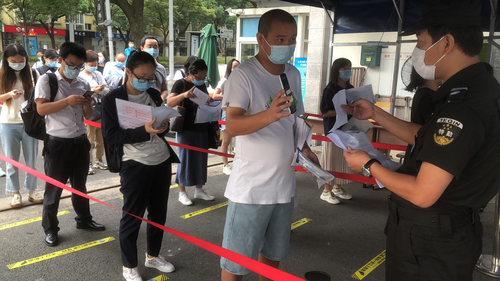 在南京市女子中專學(xué)校,考場外酒精、消毒液、消毒濕巾一應(yīng)俱全。經(jīng)過測溫、出示健康碼、行程碼、48小時核酸檢測報告,簽署承諾書等一系列流程,考生們信心滿滿走進(jìn)考場。