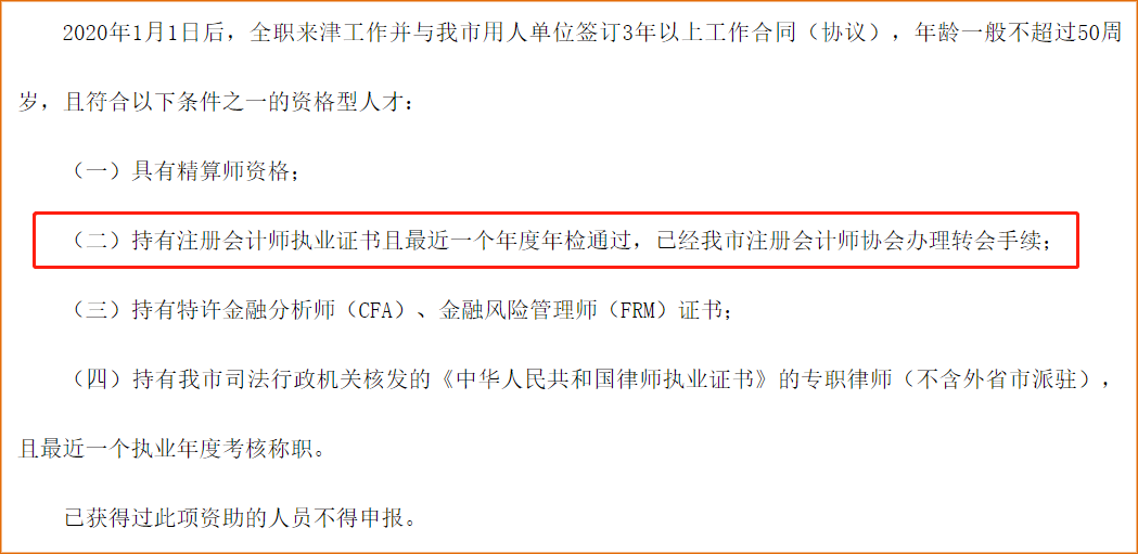 從《天津市人社局關(guān)于開展2021年資格型人才引進(jìn)專項(xiàng)資助申報(bào)工作的通知》中我們能夠得知:2020年1月1日后,全職來津工作并與我市用人單位簽訂3年以上工作合同(協(xié)議),年齡一般不超過50周歲,持有注冊(cè)會(huì)計(jì)師執(zhí)業(yè)證書且最近一個(gè)年度年檢通過,已經(jīng)我市注冊(cè)會(huì)計(jì)師協(xié)會(huì)辦理轉(zhuǎn)會(huì)手續(xù)的注冊(cè)會(huì)計(jì)師,可獲得3萬元獎(jiǎng)勵(lì)資助。