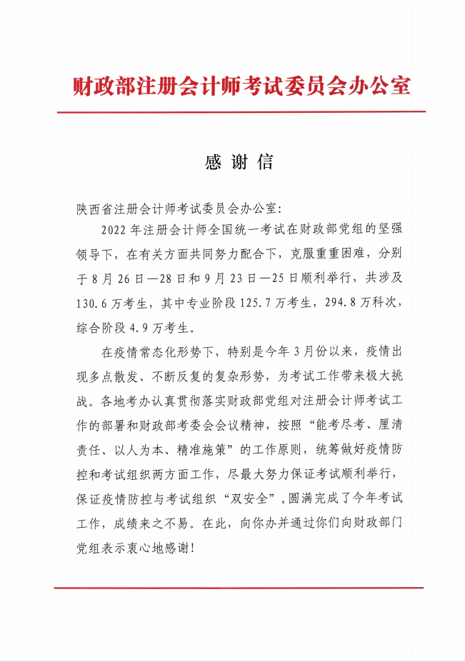 財政部注冊會計師委員會對陜西省注會考試順利進(jìn)行的感謝信