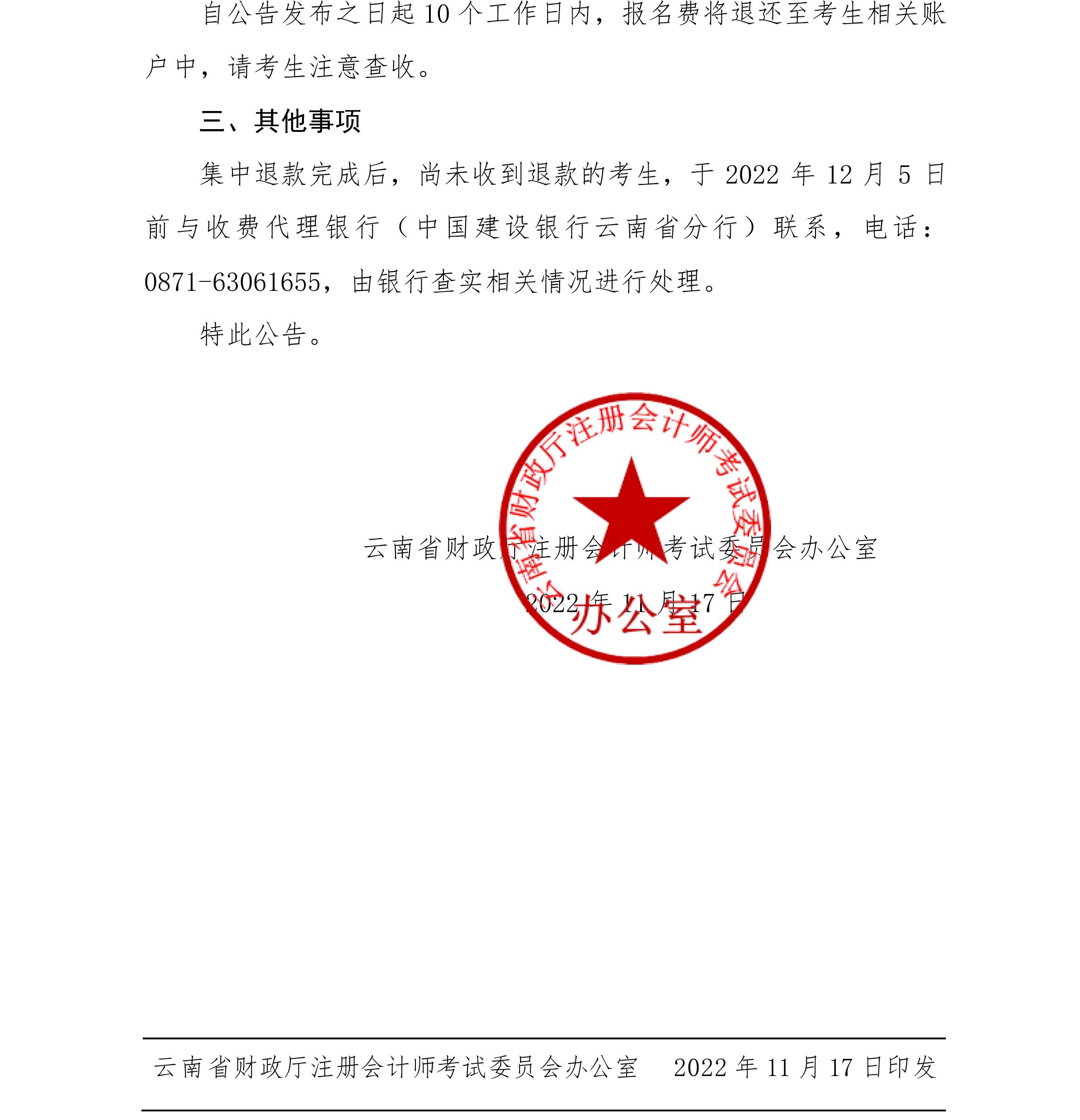 云南:關于2022年度注冊會計師全國統(tǒng)一考試退費相關工作的公告
