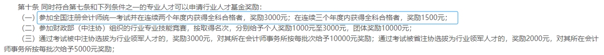 專職在本省會計師事務(wù)所從業(yè)滿3年,參加注冊會計師全國統(tǒng)一考試并在連續(xù)兩個年度內(nèi)獲得全科合格者,獎勵3000元;在連續(xù)三個年度內(nèi)獲得全科合格者,獎勵1500元?。