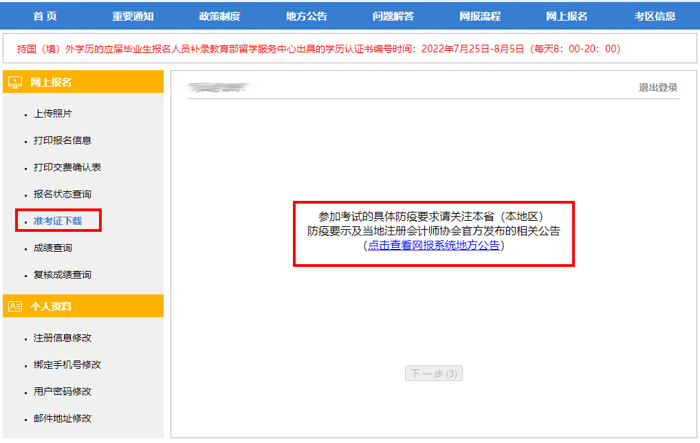 閱讀《注冊會計師全國統(tǒng)一考試違規(guī)行為處理辦法》,在仔細看過后點擊“下一步”;