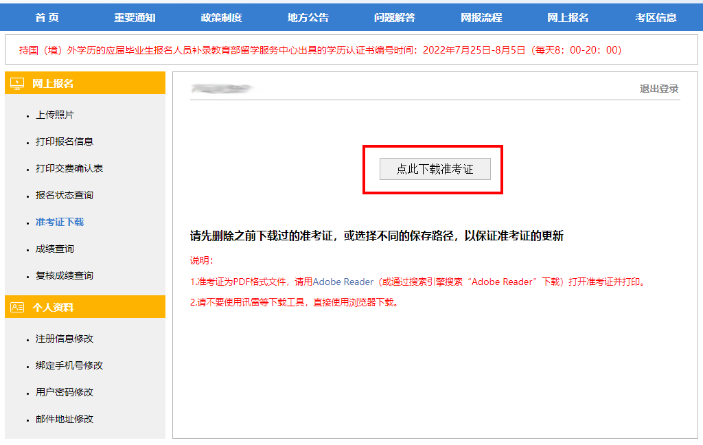 點擊“準考證打印”,閱讀考場守則后點擊“下載準考證”。