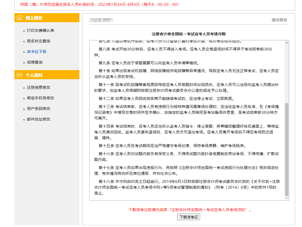 第四步:閱讀《注冊會計(jì)師全國統(tǒng)一考試應(yīng)考人員考場守則》,點(diǎn)擊“下載準(zhǔn)考證”按鈕;