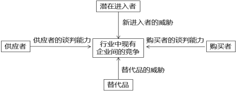 邁克爾·波特教授提出的“五力模型”分析法是分析行業(yè)結(jié)構(gòu)的重要工具。在一個行業(yè)里,普遍存在著五種基本競爭力量,即潛在進(jìn)入者的威脅、行業(yè)中現(xiàn)有企業(yè)間的競爭、替代品的威脅、購買者的談判能力和供應(yīng)者的談判能力,如下圖所示。這五種基本競爭力量的狀況以及綜合強(qiáng)度,引發(fā)行業(yè)內(nèi)在結(jié)構(gòu)的變化,從而決定著行業(yè)內(nèi)部競爭的激烈程度,決定了誰是行業(yè)中獲得利潤最大化的最終贏家。