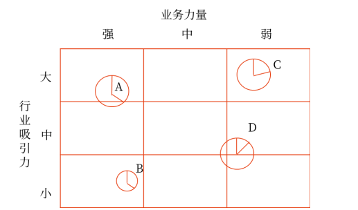 這個(gè)地帶的行業(yè)吸引力偏小,戰(zhàn)略業(yè)務(wù)單位的業(yè)務(wù)力量偏弱。因此,企業(yè)對(duì)這個(gè)地帶的戰(zhàn)略業(yè)務(wù)單位(圖中D)要“開(kāi)紅燈”,采取收割或放棄的戰(zhàn)略。