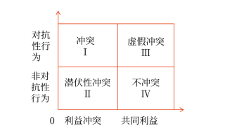 ②象限Ⅱ。潛伏性沖突是指存在利益沖突,但不存在對抗性行為。