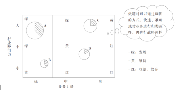 從左下角到右上角的對角線地帶 (“黃色地帶”) | B、C | “小強(qiáng)” “中中” “大弱” | 行業(yè)吸引力和戰(zhàn)略業(yè)務(wù)單位的業(yè)務(wù)力量居于一般水平 | “開黃燈”,采取維持現(xiàn)有投資水平和市場占有率的戰(zhàn)略 |
