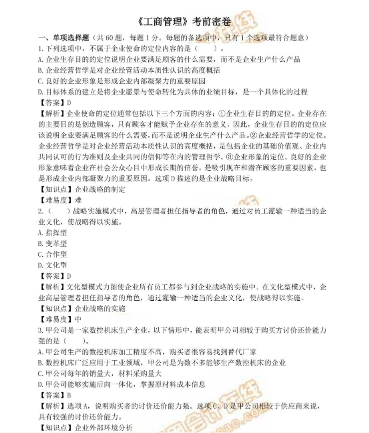2025年中級經(jīng)濟師《工商管理》考前模擬試卷,涵蓋企業(yè)戰(zhàn)略、市場營銷、生產(chǎn)管理、人力資源規(guī)劃等核心章節(jié),題型包括單選、多選及案例分析,旨在全面檢驗考生對專業(yè)知識的掌握與應用能力,助力考生高效備考,備考進度過半的同學們快來試試這套模擬試卷吧,建議同學們嚴格按照單科90分鐘進行作答。