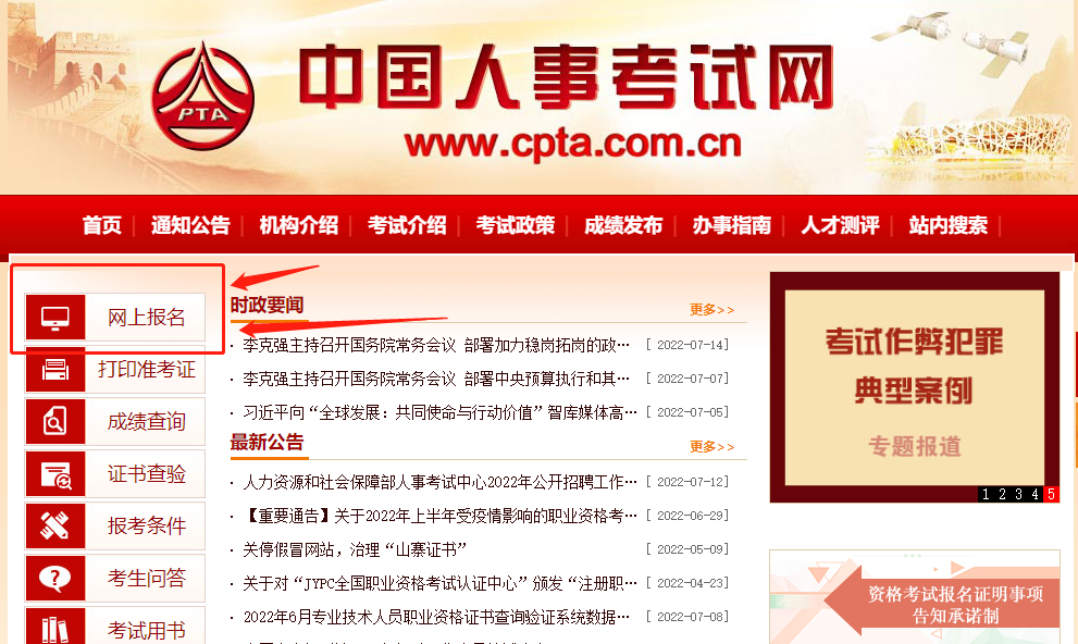 中級經(jīng)濟(jì)師考試從中國人事考試網(wǎng)報名,報名入口是全國統(tǒng)一的,進(jìn)入中國人事考試網(wǎng)官網(wǎng)(http://www.cpta.com.cn/)我們即可看到左側(cè)“網(wǎng)上報名”字樣,如圖: