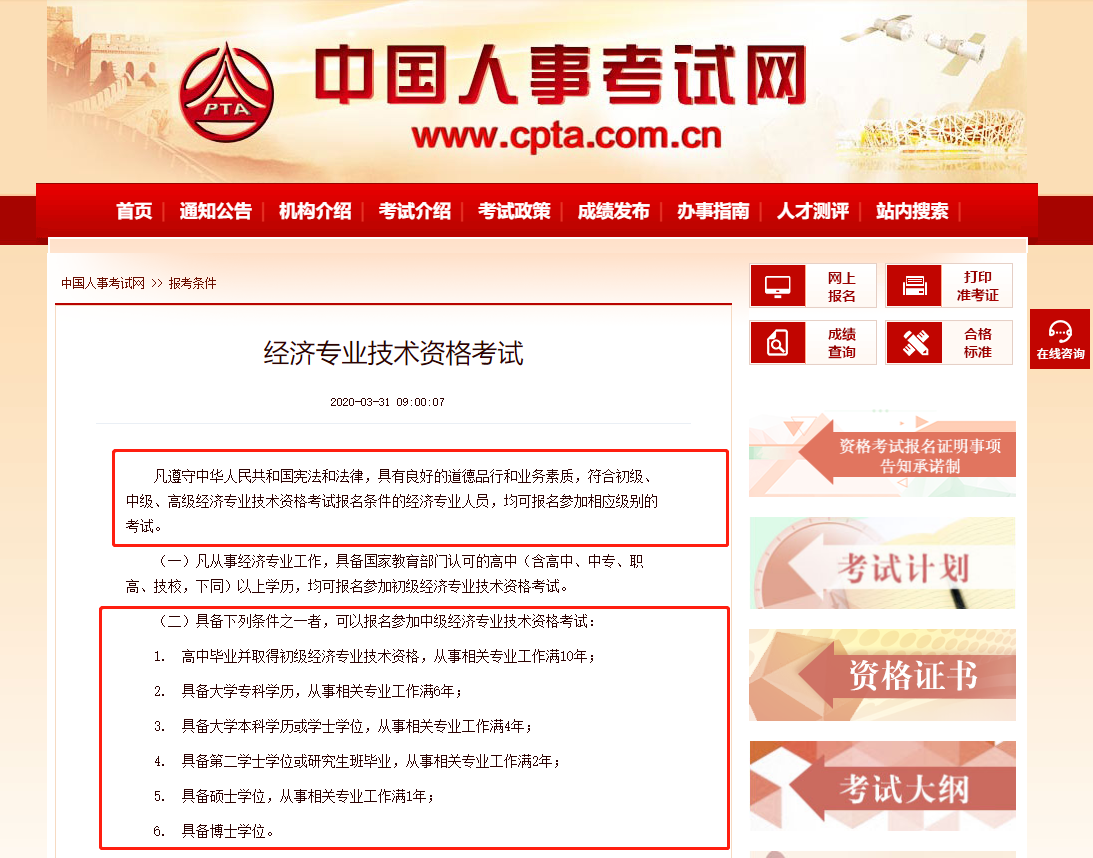 中級(jí)經(jīng)濟(jì)師只要是大專(zhuān)及以上學(xué)歷并滿(mǎn)足對(duì)應(yīng)的工作年限要求即可直接報(bào)考中級(jí)經(jīng)濟(jì)師,不需要初級(jí)經(jīng)濟(jì)師證書(shū);中級(jí)經(jīng)濟(jì)師考試報(bào)名條件由中國(guó)人事考試網(wǎng)統(tǒng)一發(fā)布,考生可以打開(kāi)中國(guó)人事考試網(wǎng)(網(wǎng)址:http://www.cpta.com.cn/)點(diǎn)擊“報(bào)名條件”欄目,找到“經(jīng)濟(jì)專(zhuān)業(yè)技術(shù)資格考試”就可以看到以下報(bào)名條件: