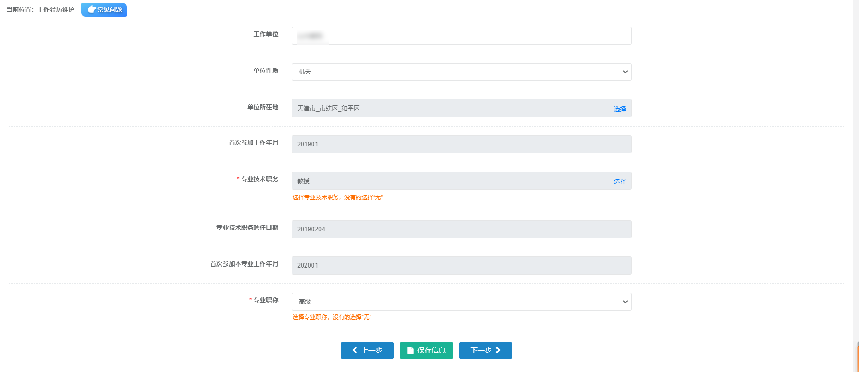 需填寫:工作單位、單位性質(zhì)、單位所在地、首次參加工作年月、專業(yè)技術(shù)職務(wù)、專業(yè)技術(shù)職務(wù)聘任日期、首次參加本專業(yè)年月、專業(yè)職稱,專業(yè)技術(shù)職務(wù)和專業(yè)職稱帶有“*”符號,為必填項目。