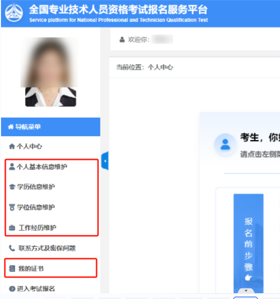 變化三:報(bào)名界面左側(cè)導(dǎo)航菜單欄,新增“個(gè)人基本信息維護(hù)、學(xué)歷信息維護(hù)、學(xué)位信息維護(hù)、工作經(jīng)歷維護(hù)、我的證書(shū)”選項(xiàng)。