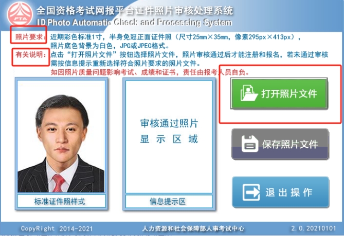 審核照片:用中國(guó)人事考試網(wǎng)提供的 “資格考試網(wǎng)報(bào)平臺(tái)證件照片審核處理系統(tǒng)” 審核照片。先下載安裝 “照片審核處理工具”,點(diǎn)擊 “打開照片文件” 按鈕選擇照片,如照片符合要求將會(huì)顯示 “審核通過(guò)”,審核通過(guò)后,點(diǎn)擊 “保存照片文件” 按鈕,保存審核合格后的照片文件。