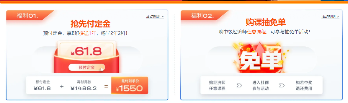 購(gòu)課抽免單:購(gòu)中級(jí)經(jīng)濟(jì)師任意課程,可參與抽免單活動(dòng)!