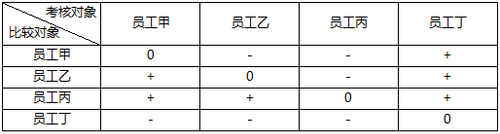 某企業(yè)某部門運(yùn)用一一對(duì)比法對(duì)所屬的4名員工進(jìn)行績(jī)效考核。考核情況如下表所示,由此可知,績(jī)效最差的員工是( )。