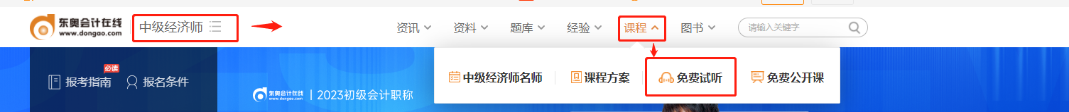 進(jìn)入方法1:進(jìn)入東奧中級經(jīng)濟(jì)師主頁→導(dǎo)航欄→課程→免費(fèi)試聽