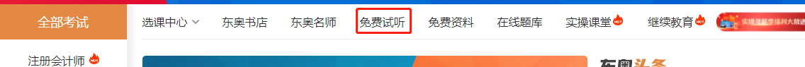 進(jìn)入方法2:進(jìn)入東奧會計(jì)在線主頁→導(dǎo)航欄免費(fèi)試聽→中級經(jīng)濟(jì)師