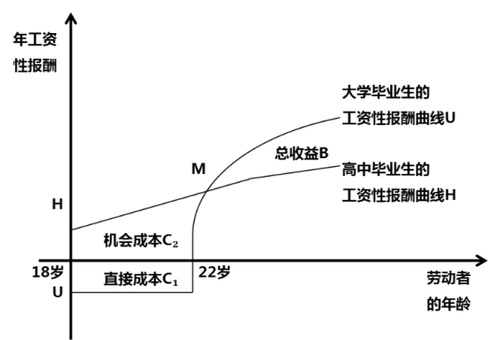 B部分的面積大于C1+C2部分的面積,則一個(gè)人上大學(xué)就是值得的,否則,從經(jīng)濟(jì)角度來(lái)說(shuō),就是沒(méi)有意義的 |