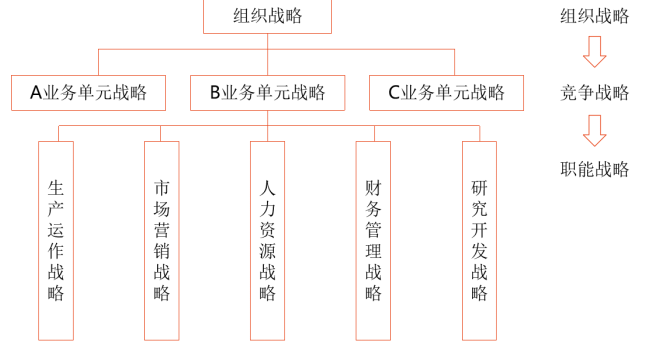 一個組織的戰(zhàn)略通常包括三個層次:組織戰(zhàn)略層次、競爭戰(zhàn)略層次、職能戰(zhàn)略層次。