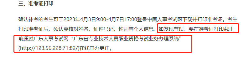 3.考生打印準(zhǔn)考證后,須認(rèn)真核對姓名、證件號碼、性別等個人信息,如發(fā)現(xiàn)有誤請及時聯(lián)系所在考區(qū)的人事考試機(jī)構(gòu)或部分地區(qū)明確標(biāo)明可在官網(wǎng)辦理信息有誤的問題,例如廣東: