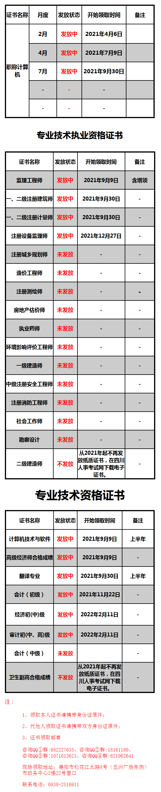四川德陽(yáng)市人力資源與社會(huì)保障局發(fā)布2021年中級(jí)經(jīng)濟(jì)師合格證書(shū)領(lǐng)取通知,根據(jù)官方通知我們得知,中級(jí)經(jīng)濟(jì)師21年度證書(shū)正在發(fā)放中,證書(shū)領(lǐng)取開(kāi)始時(shí)間為22年2月11日,領(lǐng)取方式分為郵寄和現(xiàn)場(chǎng)領(lǐng)取兩種方式,具體的領(lǐng)取地址以及郵寄方式請(qǐng)看以下公告內(nèi)容: