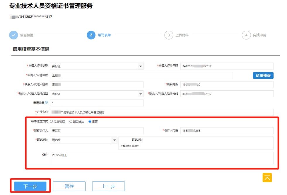 3.在“結(jié)果送達(dá)方式”中選擇“郵寄”,完善郵寄收件人姓名、電話、地址等信息,在“備注”欄填寫擬申領(lǐng)的證書名稱和考取年度,如“2022年社工”點(diǎn)擊“下一步”,最后在跳轉(zhuǎn)的頁(yè)面中點(diǎn)擊“提交”即可完成。