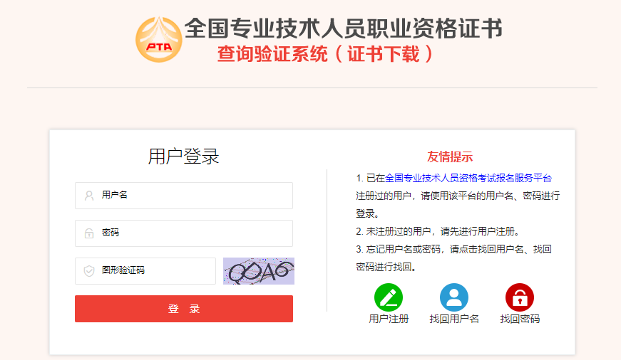 2.證書下載入口:在打開的頁面中點擊 “證書下載” 按鈕,進(jìn)入登錄頁面。如果您已經(jīng)在中國人事考試網(wǎng) “全國專業(yè)技術(shù)人員資格考試報名服務(wù)平臺” 注冊過賬號,請直接使用該平臺的用戶名、密碼進(jìn)行登錄;若未注冊過,則需點擊“用戶注冊”按鈕進(jìn)行注冊,注冊時請使用取得證書時所用證件的證件號碼,以確保信息的準(zhǔn)確性。