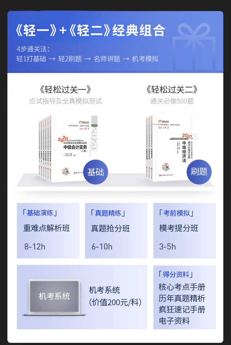 考證以來都是用的輕一從初級(jí)到中級(jí)對(duì)我來說輕一是非常的全面的,同時(shí)又有歷年真題和章節(jié)練習(xí),單靠輕一拿下中級(jí)完全沒問題??