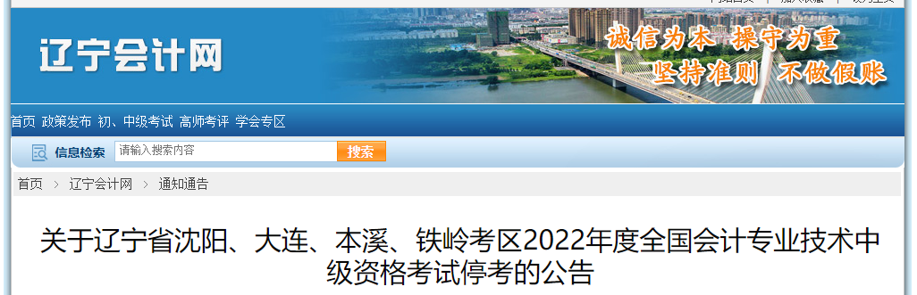 關(guān)于遼寧省沈陽(yáng)、大連、本溪、鐵嶺考區(qū)2022年度全國(guó)會(huì)計(jì)專業(yè)技術(shù)中級(jí)資格考試停考的公告