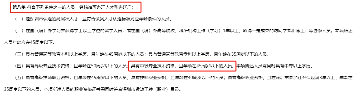 深圳市人民政府關(guān)于印發(fā)深圳市戶籍遷入若干規(guī)定的通知,其中顯示,“具有中級(jí)專業(yè)技術(shù)資格,且年齡在45周歲以下的人員經(jīng)核準(zhǔn)可以辦理人才引進(jìn)遷戶!相關(guān)通知如下: