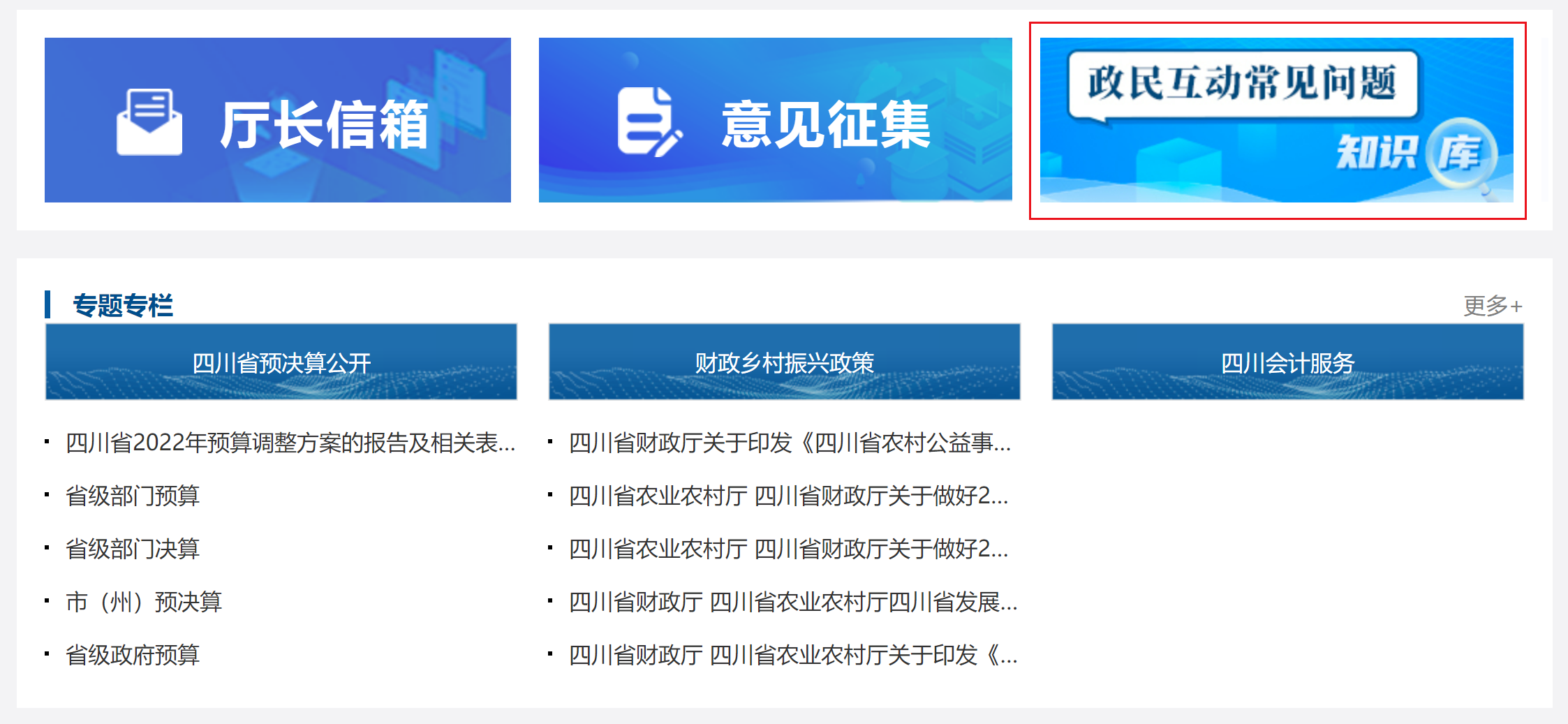 方式三:點擊進入“四川省財政廳”網(wǎng)站首頁下方“政民互動常見問題知識庫”—“會計專業(yè)技術(shù)資格考試”—“考試管理機構(gòu)聯(lián)系方式?”
