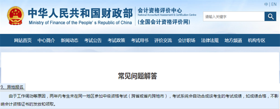 由以上財政部對于常見問題的解答中,大家可以清晰的看到,由于工作調(diào)動等原因,兩年內(nèi)考生未在同一地區(qū)參加中級資格考試(跨省或省內(nèi)跨地市),考試系統(tǒng)會自動合成該考生的考試成績,如成績合格,不影響會計資格證書的發(fā)放和領(lǐng)取。
