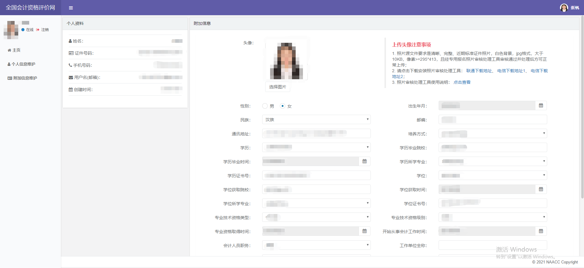 成功登錄系統(tǒng)后,進(jìn)入個(gè)人主頁(yè)。鼠標(biāo)移動(dòng)到頁(yè)面右上角的頭像,顯示下拉菜單,點(diǎn)擊菜單,可進(jìn)行相應(yīng)的操作。點(diǎn)擊附加信息維護(hù),即可提前填寫(xiě)報(bào)名相關(guān)信息以及照片等!