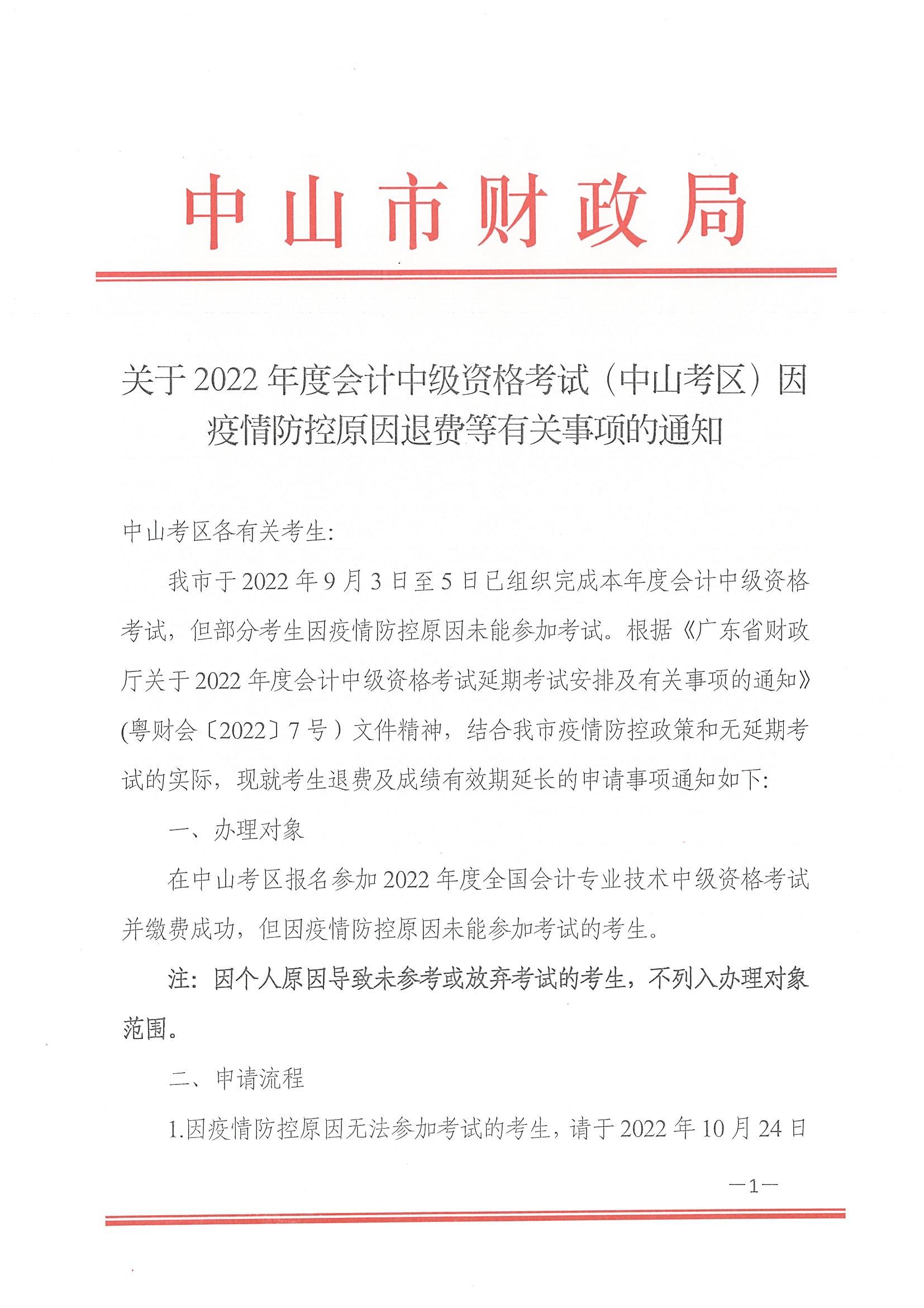 廣東省中山市2022年中級會計(jì)考試退費(fèi)及有關(guān)事項(xiàng)的通知已發(fā)布!受疫情影響,不能參加2022年中級會計(jì)考試的考生請?jiān)谝?guī)定時間內(nèi)申請退費(fèi)!詳情如下!