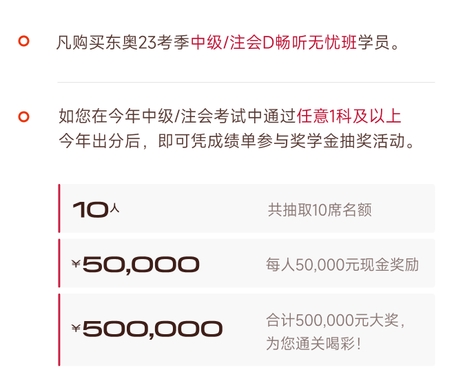參加23年中級考試,并最終23年成績有1科及格通過。同時(shí)滿足以上兩個(gè)條件的東奧學(xué)員,即有資格參與50萬現(xiàn)金均分活動(dòng)。