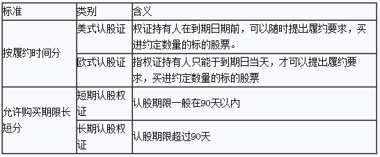 按買或賣的不同權(quán)利,權(quán)證可分為認購權(quán)證(認股權(quán)證)和認沽權(quán)證,又稱為看漲權(quán)證和看跌權(quán)證。